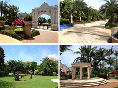 走进森海湾,红瓦白墙、单边回廊的建筑设计,与郁郁葱葱的植物一起,构建了一个海湾童话城堡世界,营造出闲适、惬意、温馨、雅致的居住氛围。据项目负责人叶伟华介绍,作为一个高端住宅区,森海湾对园林景观的要求比较高,小区以中轴景观带为主景,设有游泳池、休闲草坪、叠水等,种植大王椰、霸王棕、凤凰木、重阳木、中东海枣、老人葵等大树衬托整个中央主景。各处庭院则选择丰富多彩的树种,采用不同的手法布局与建筑完美融合,透露出精细的西班牙情调,用简单诠释浪漫,点缀悠闲的度假生活,使整个园林充盈着浓郁的热带风情。
