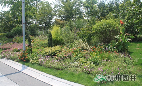 人来人往的杭州火车东站西广场,草坪碧绿,树木葱郁,更有一座名为“西湖印象”的立体花坛吸引着众多游客的眼。而在广场通往天城路方向的一片草坪里,一处100平方米左右的花境小品却格外引人注目,红黄粉交相辉映的五色梅、叶秀花艳的香彩雀、紫色优雅的翠芦莉、飘逸秀气的小兔子狼尾草、青翠挺立的直立冬青、叶色嫩黄的黄金香柳……丰富的品种,艳丽的色彩,既展现出植物的色彩美,又营造出丰富的群落美,使得这处小花境成为这片风景的点晴之笔。