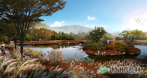 上湘湖突出湿地花卉的群体效果;中湘湖结合湖岸和岛屿片状种植禾本高草类水生植物,形成十月芦花飞扬的景象。