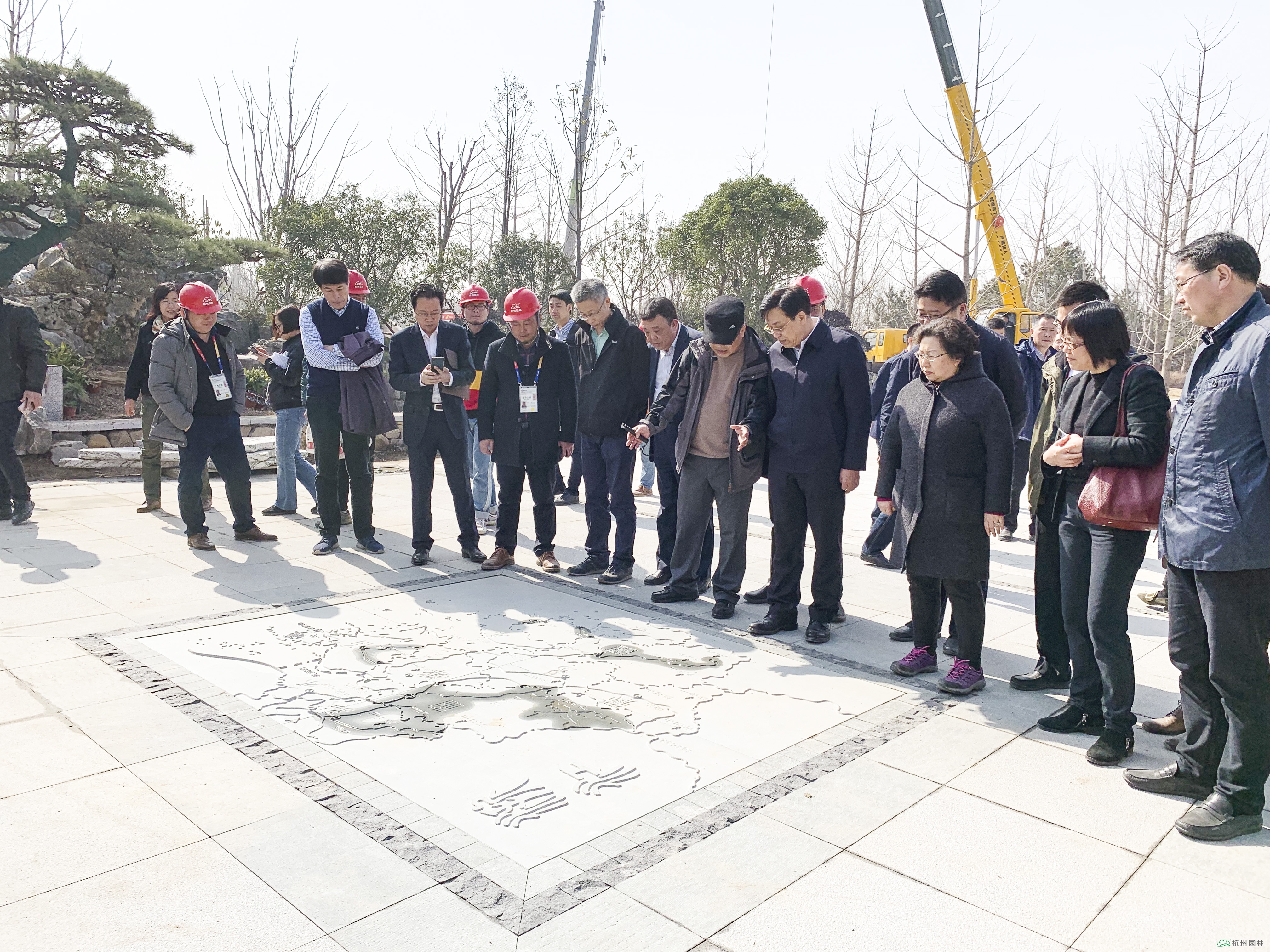 浙江省委常委、常务副省长冯飞(右二)听取现场情况介绍,杭州园林董事长吴光洪(右一)陪同
